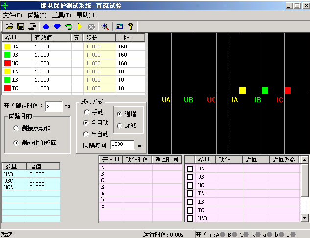 直流試驗?zāi)K提供專門的直流電壓和電流輸出,主要是為了滿足做直流電壓繼電器、時間繼電器以及中間繼電器等試驗的要求。直流模塊的主界面如圖所示: